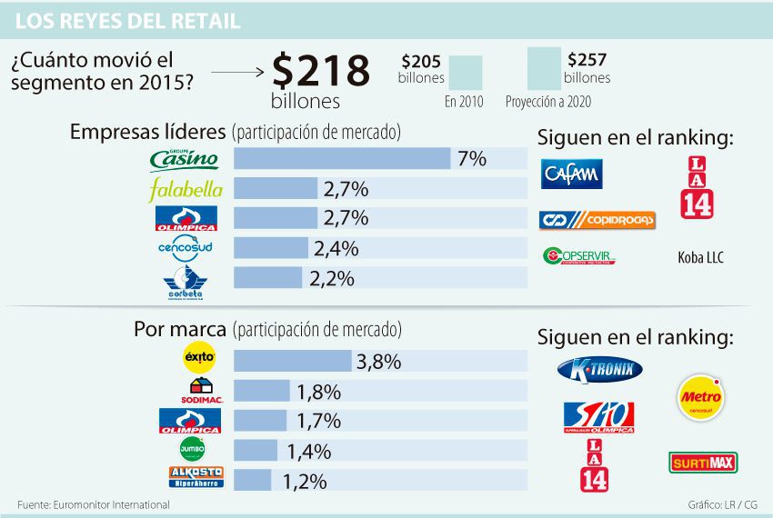 Teniendo en cuenta a las empresas líderes (que cuentan con más de una marca en el mercado), encabezan el ranking Casino Guichard-Perrachon SA, Falabella y Supertiendas & Droguerías Olímpica, con 7%, 2,7% y 2,7%, respectivamente, dentro de un nicho en el que participan más de 49 marcas.