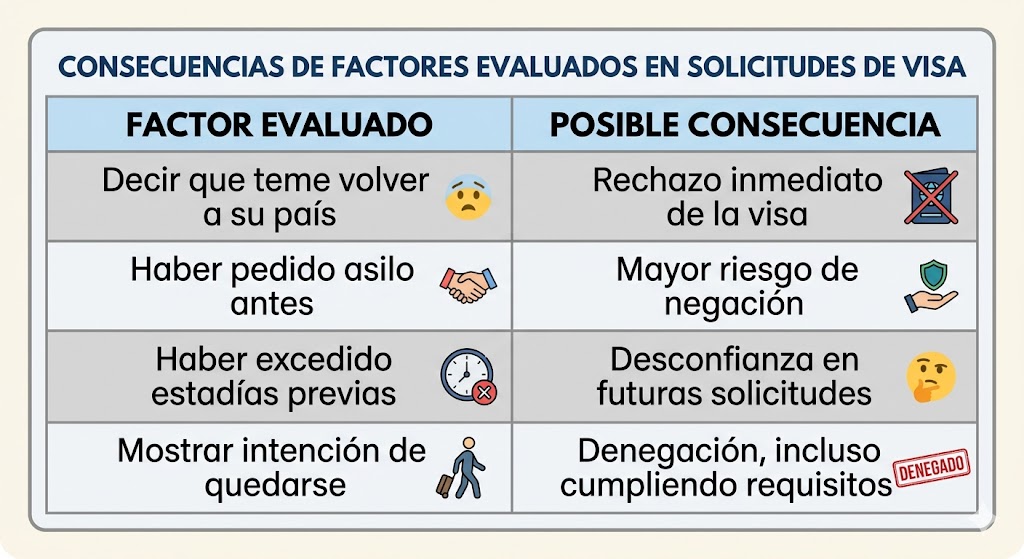 Las autoridades consulares no aplicarían esta evaluación de manera aislada, sino dentro de un análisis más amplio del perfil del solicitante. Entre los factores que podrían revisarse se incluyen el historial de viajes a Estados Unidos, posibles excedencias en estadías anteriores, solicitudes previas de asilo y cualquier señal de intención de permanencia irregular.
